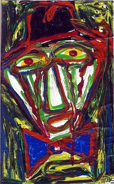 Most of his paintings I found are portraits, usually a single face occupying the whole canvas. He usually used 6*9 inch canvas, about the size of our sketchbook. He used “thick layers of acrylics, oil paint, watercolors, pastels, crayons, pens”… basically everything at hand, which reminds us of post-modernist bricolage. (zombieresearchsociety.com)